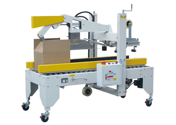 自動折蓋封箱機原理是通過對紙箱豎起的四個上蓋自動折平并自動進行膠帶封箱。